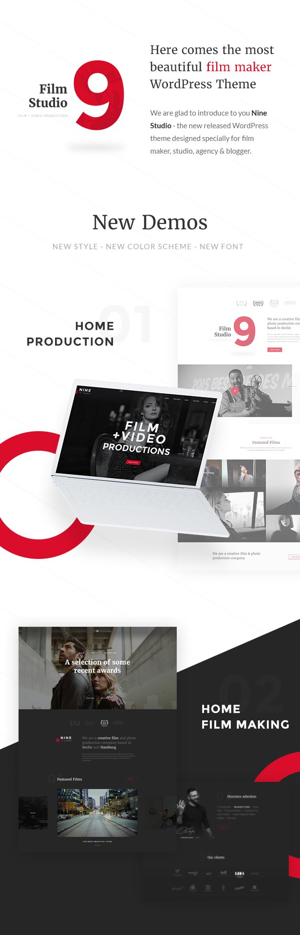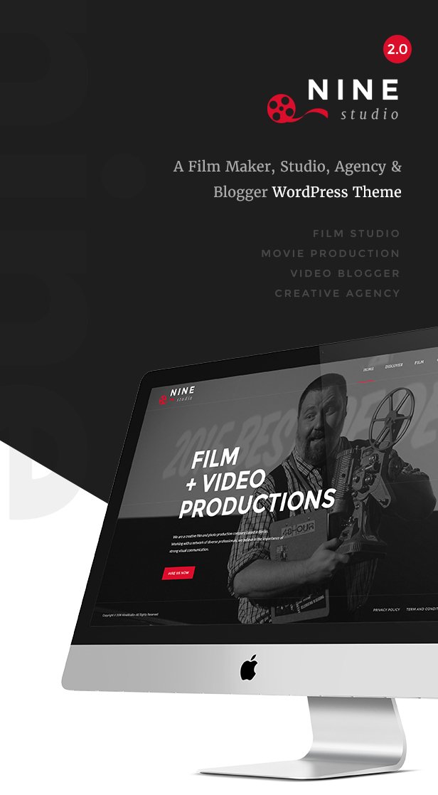 Now with New Style – New Demo – New Color Scheme – New Font Filmmaking, started way back in earlier history, with only the two basic colors of Black and White. Follows that philosophy – Nine Studio wants you to present the art of film-making through a classic feel, but still has a breath of modern days with this WordPress theme.