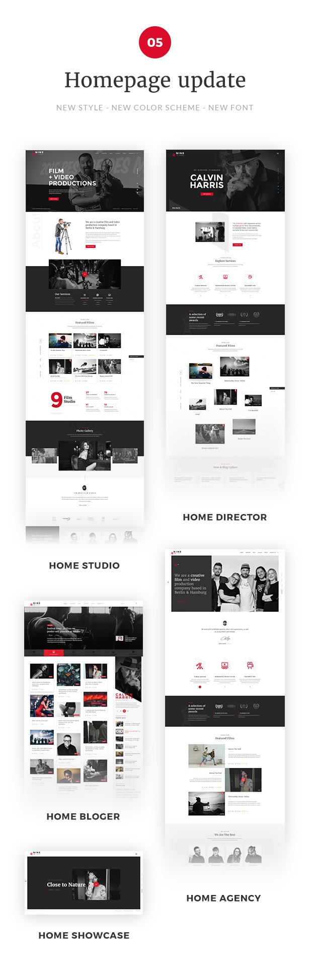Nine comes with nine graciously made homepages for different roles, functions and topics: Home Production, Home Making, Home Studio, Home Director, Home Agency, Home Blogger, Home Showcase, Home Exhibition, Home Presentation. These make up the perfect 9 templates for all your needs when it comes to site building.