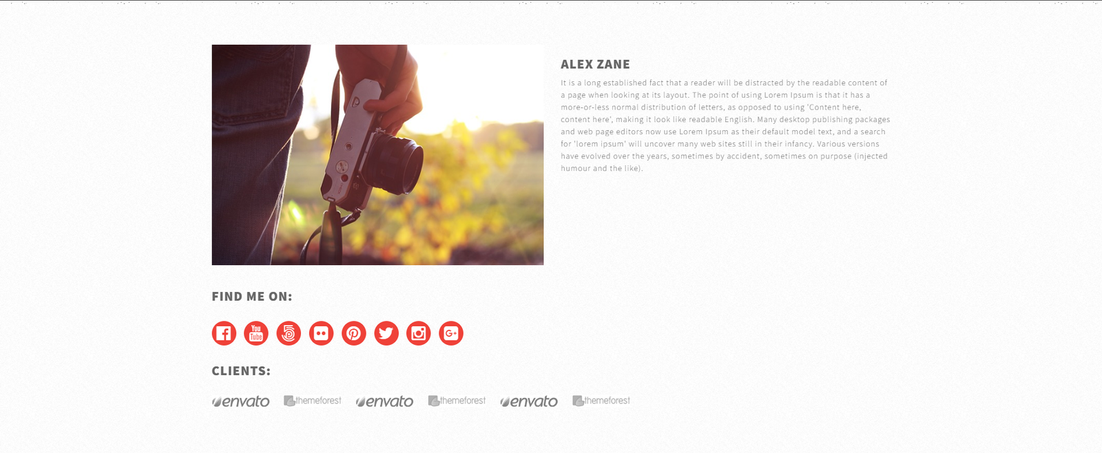 Alex – Zane is a photography portfolio template with freandly SEO, modern design and gallery. It’s easy to use and concentrates on showcasing your work to potential clients and employers with interesting interactions.
