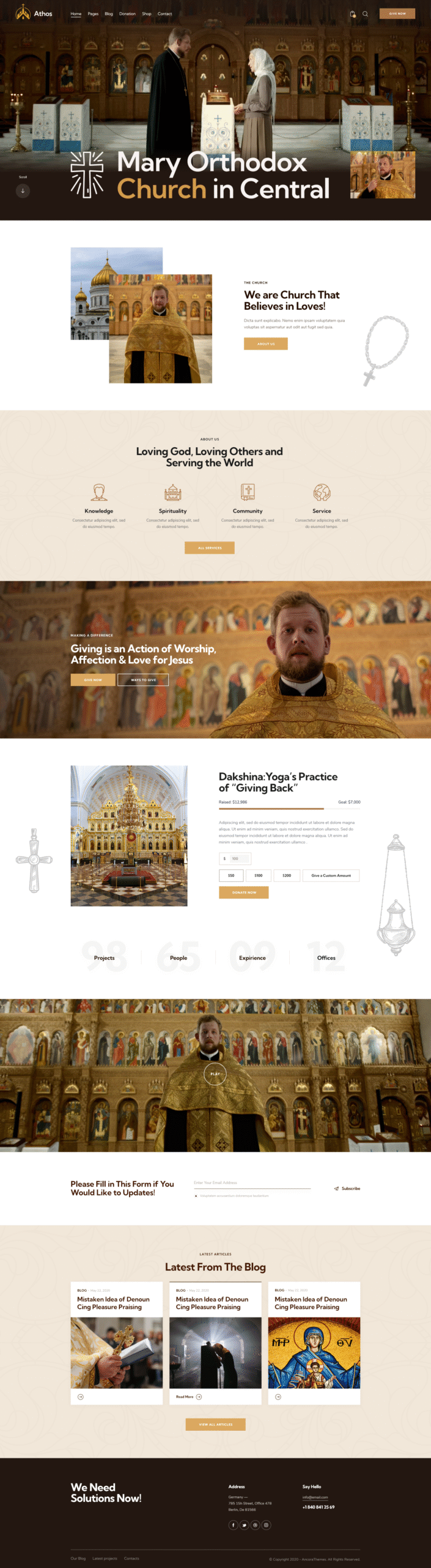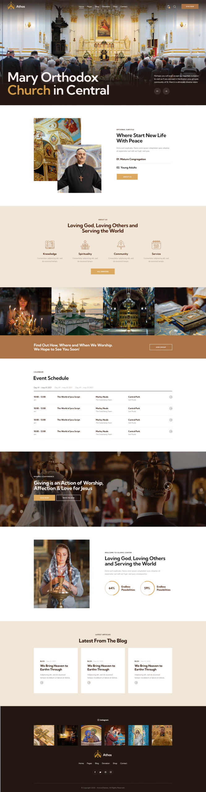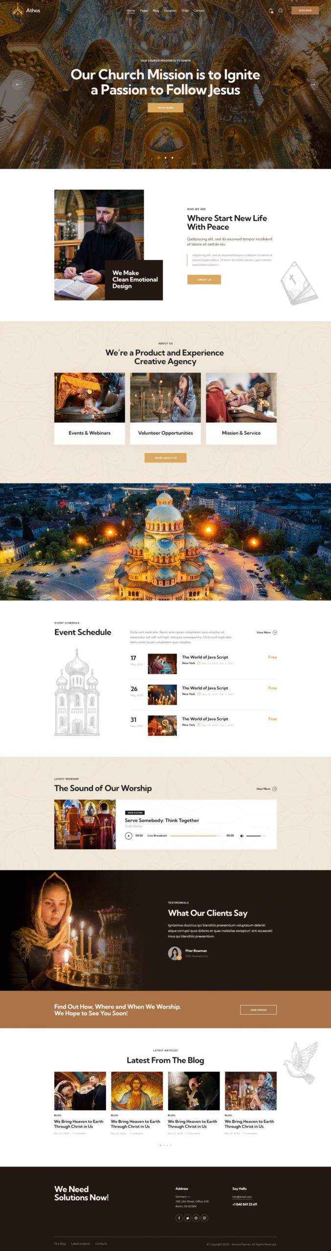 Athos is a beautiful, authentic & responsive non-profit Church WordPress Theme. It is created specifically for Orthodox Christian church, prayer group, charity, volunteering, believer community. Also it fits God leadership academy and non-profit organization.
