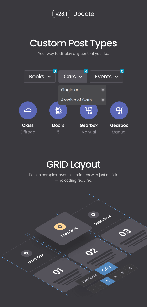 • 4 different grid layouts: 1240px Boxed, 960px Boxed, 1240px Full Width, 960px Full Width