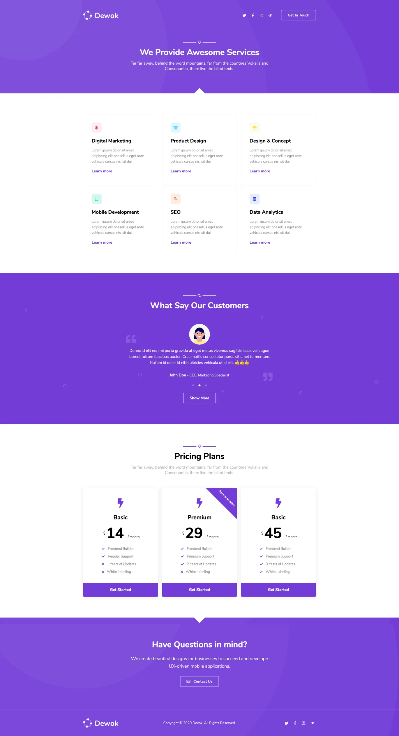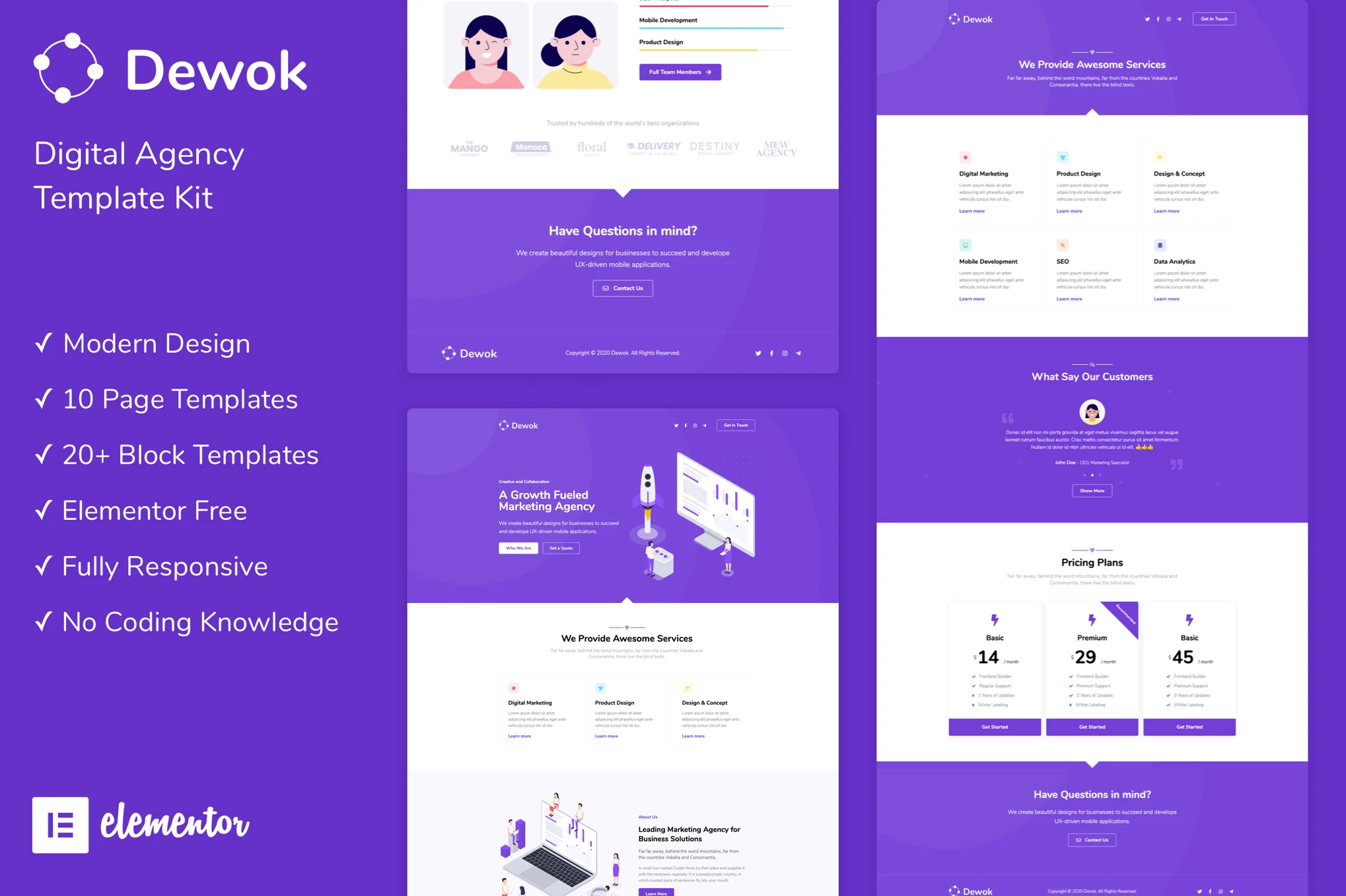 Dewok is an Elementor Template Kit perfectly suits for Digital agency, Portfolio, Startup business, and Marketing landing page websites. Its design is up to modern design trends. The Template Kit built with Elementor Free version.