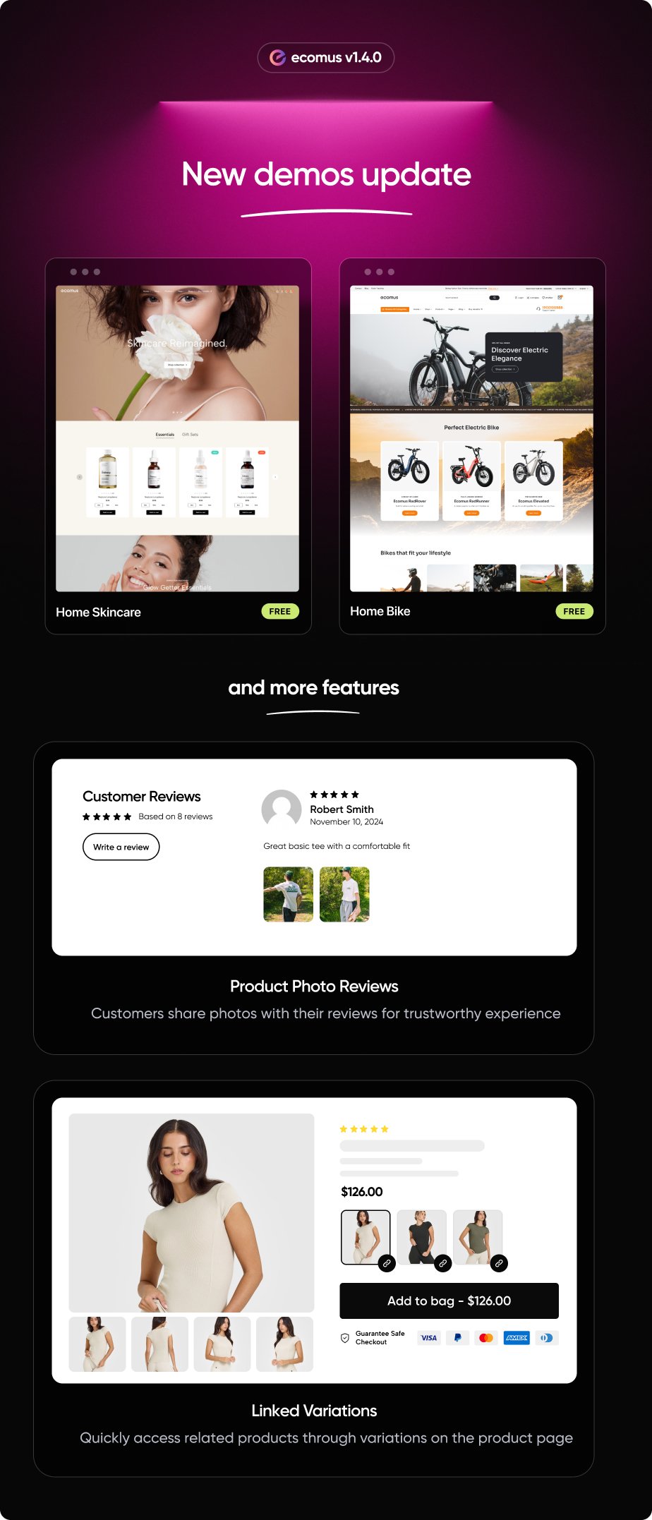 Stay up-to-date with Ecomus’s latest features and enhancements through our quick and easy one-click update system. No more worries about complex updates or potential compatibility issues.