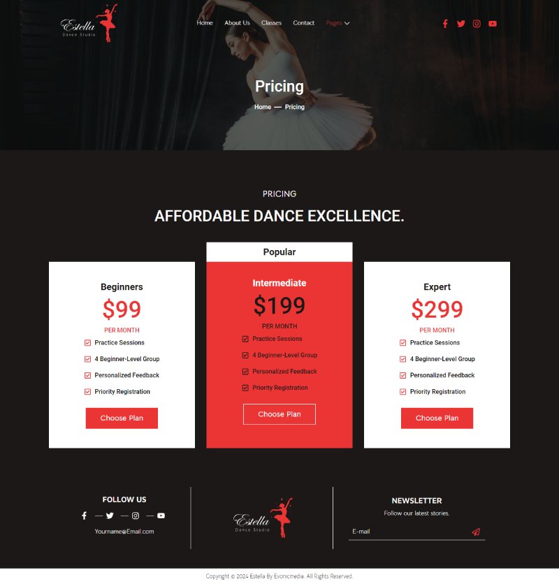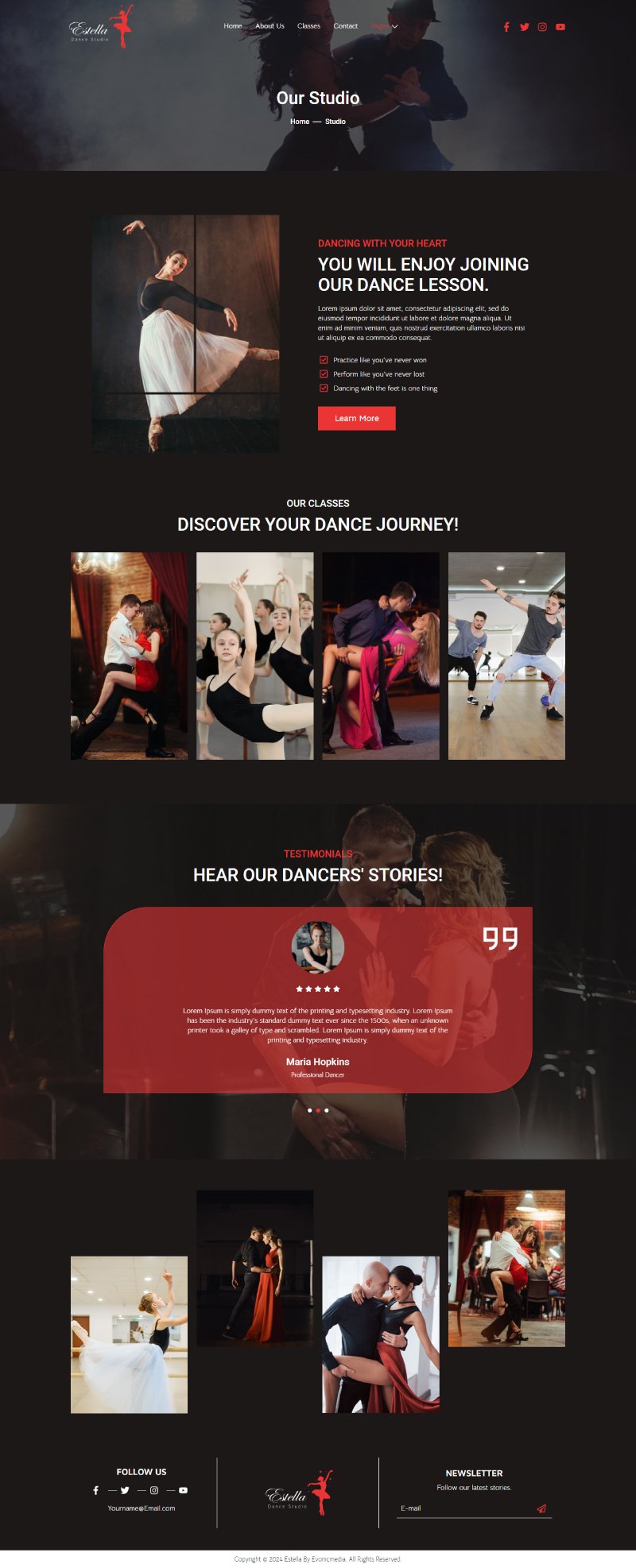 Dive into a world where every movement is celebrated, every beat resonates, and every click leads to an immersive dance experience. Elevate your studio’s online persona with Estella, where rhythm meets innovation.