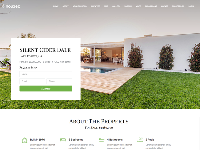 The real estate property detail page is the most flexible real estate page you can find. You can show specific properties and customize them any way you want to, letting potential buyers know all about the features of each building.