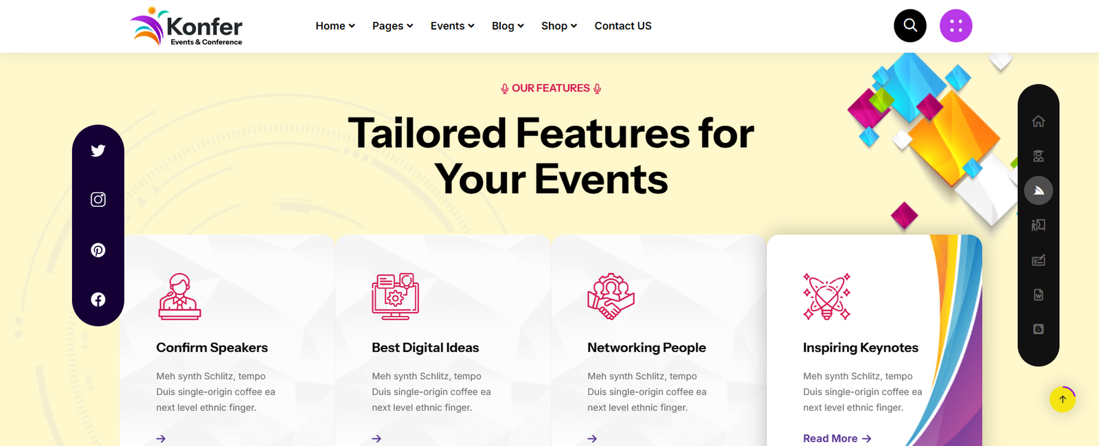 - One Click Demo Content: Install Konfer with our powerful one click installer. Get your site up and running in no time! Quick, easy and rocket fast!.