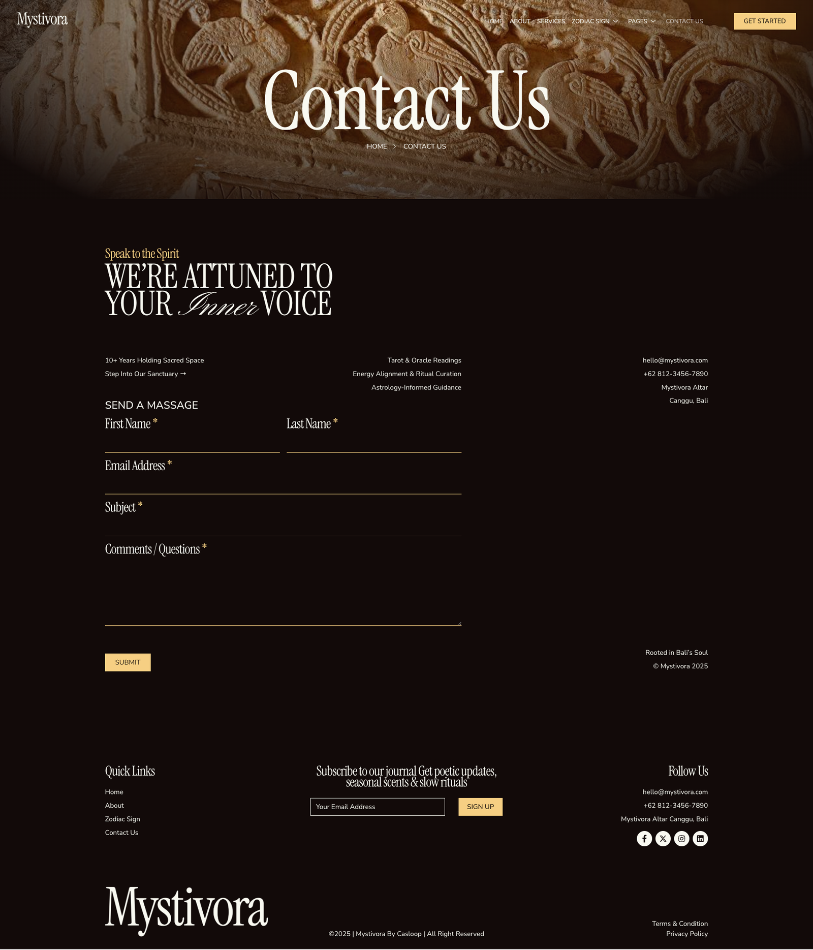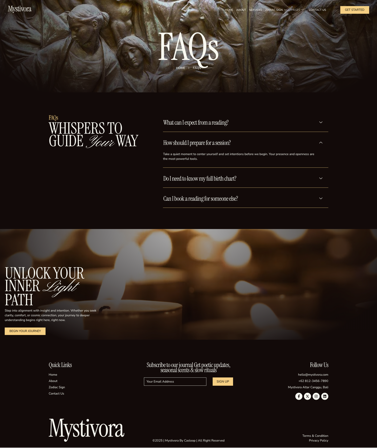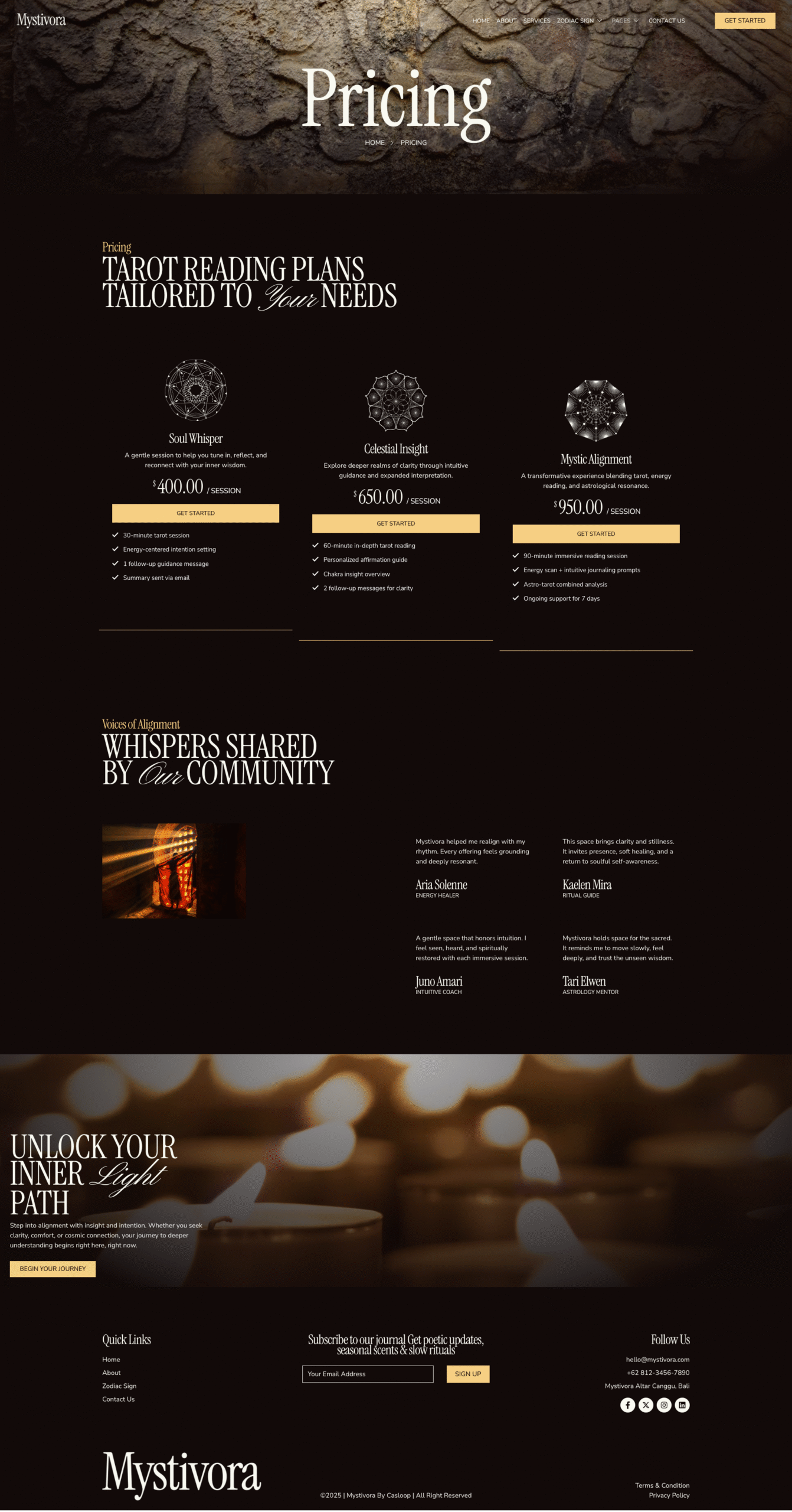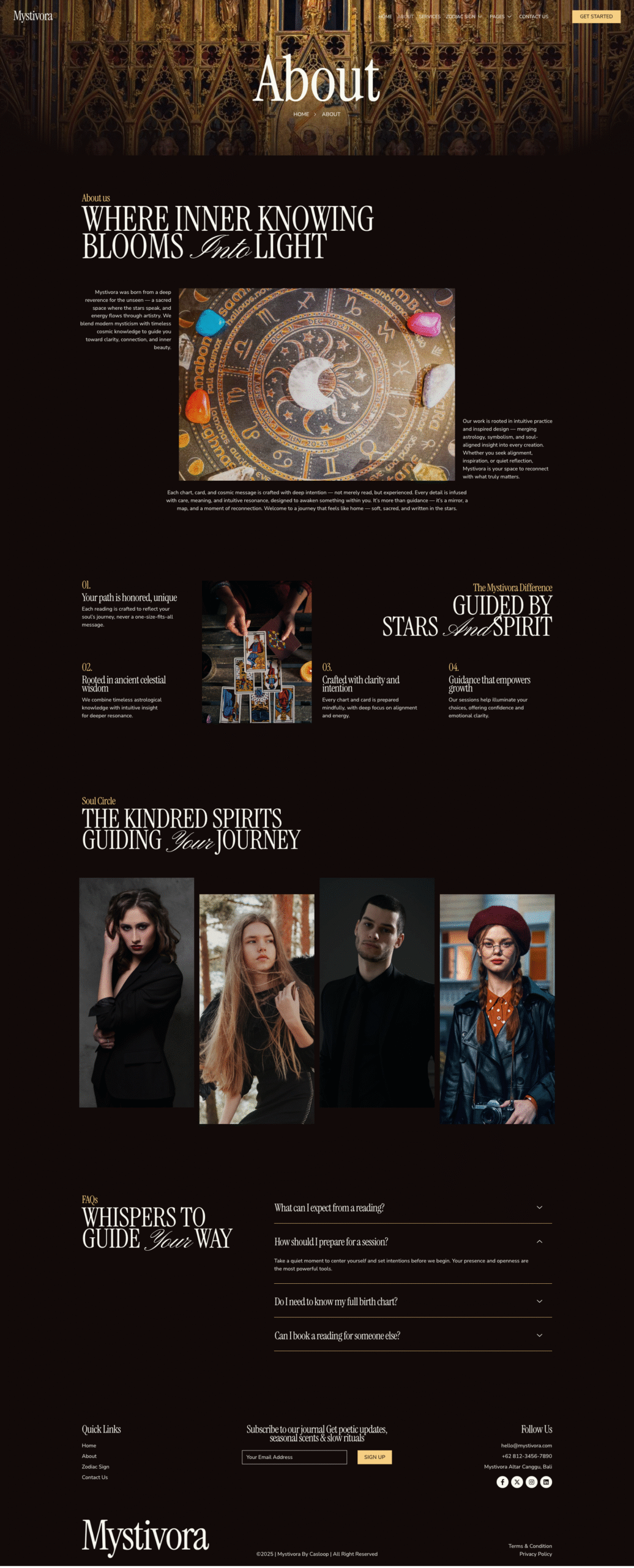 - Custom sections for services, booking, testimonials, and zodiac content