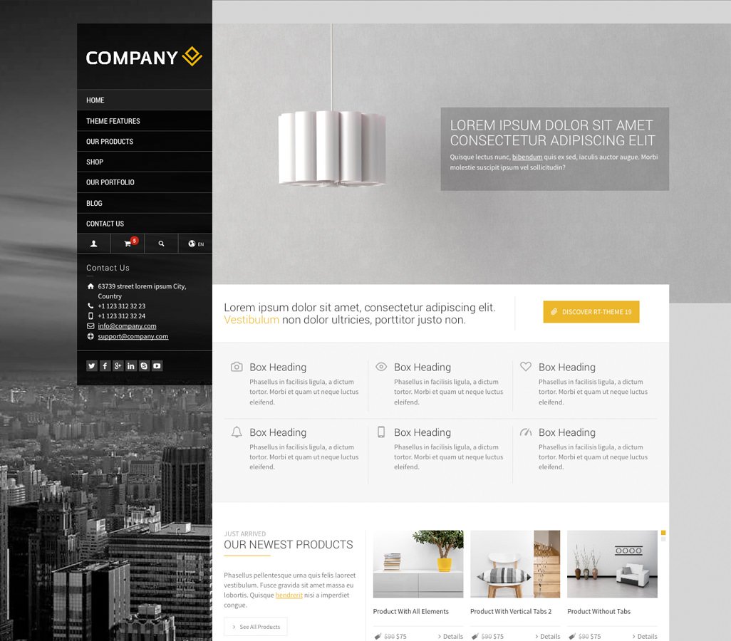 The product and portfolio tools also give you wide opportunities to create listings / custom single pages and use them in various services such as tour itineraries, rent a car, real estate, hotel presentations, and much more. You can also create an online shop with RT-Theme 19 and WooCommerce plugin. Check out the demos page to see other demos that were created only by using the theme customizer tools. All demos included the theme package and possible to switch the default skin to one of the pre-made skins with a single click. Or create your skin by using the customizer panel.